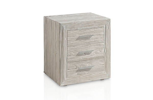 Mesita de noche con 3 cajones con estructura de madera y frente de cajones de mobila erosionada artesanalmente.