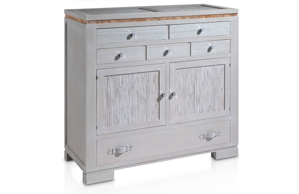 Puertas con plafones en caña de azúcar e interior con estante de madera y cuatro cajones con frente de cristal.