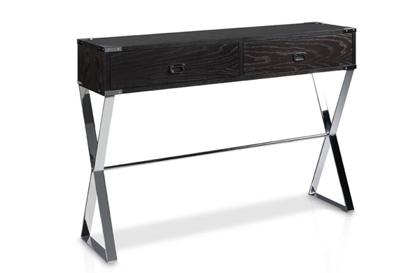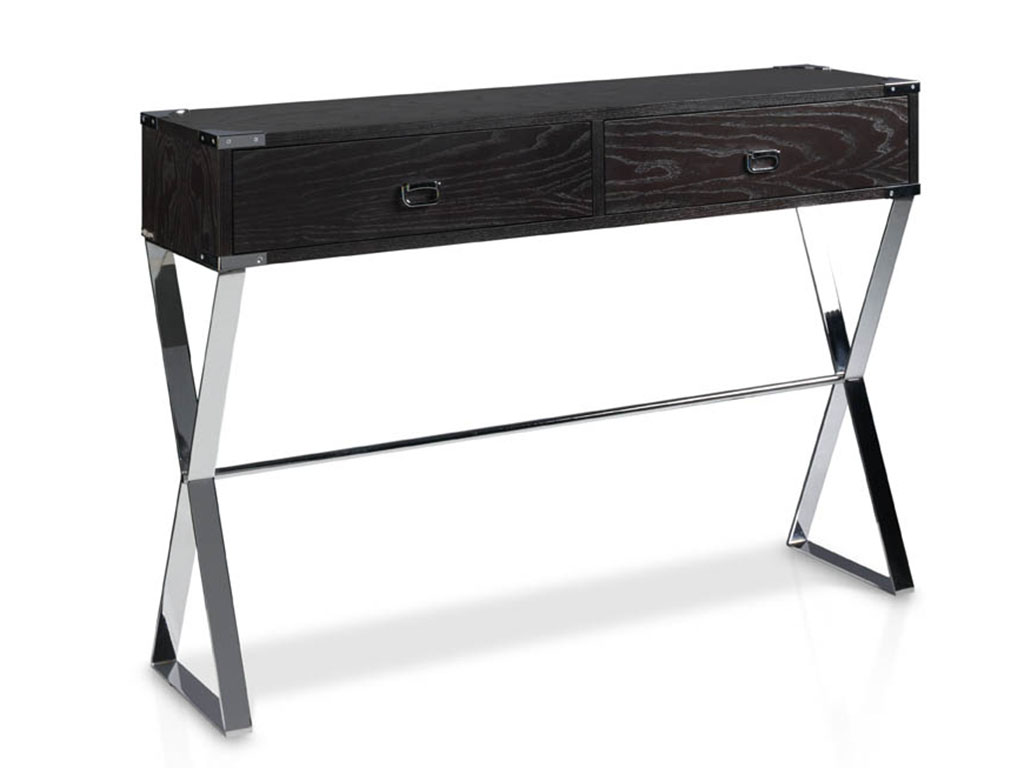 Consola fabricada en madera de fresno con dos cajones y patas metálicas.