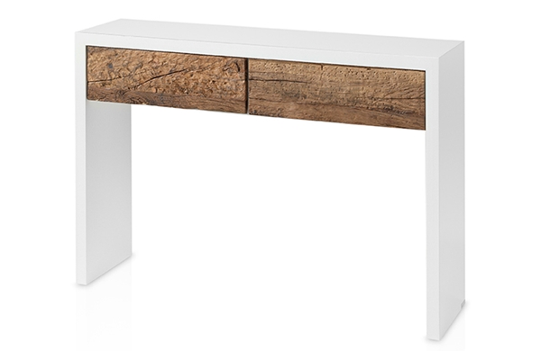 Consola fabricada en madera MDF chapada y posibilidad de pintar en todas las tonalidades de colores RAL. Los dos cajones de la consola están fabricados en madera de mobila y acabados en color Reciclado Ecológico.