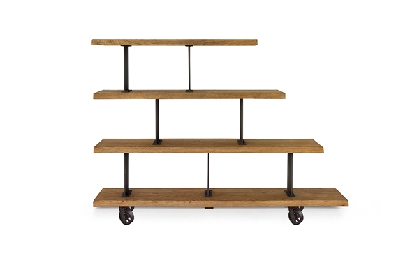 Estantería pequeña con forma de escalera y estilo industrial, fabricada en madera de roble marinado, con posibilidad de fabricarse en otras maderas como Mobila, Mobila Vieja, Fresno, Roble y LCH (liso chapado). Los separadores y ruedas están fabricados en metal y pueden pintarse en distintos acabados, Óxido Marrón (OM), Oro Viejo(OV) y Cobre Viejo (CV).