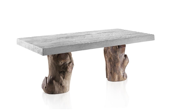 La característica principal de esta mesa de comedor son los dos pies utilizados para su soporte. Troncos macizos tratados y manipulados con técnicas especiales  para su conservación.