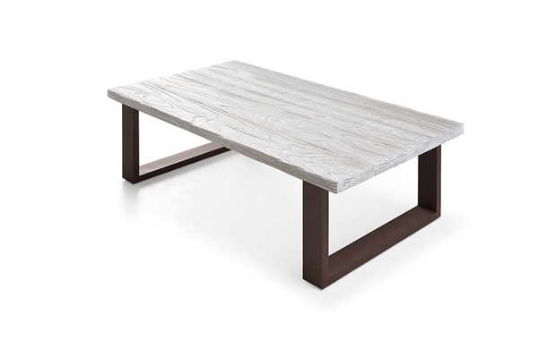 Mesa centro con sobre de madera de mobila erosionada artesanalmente y cristal opcional sobre el sobre. En las patas podemos elegir tanto unas patas de madera de fresno como patas de metal en sus distintos acabados.