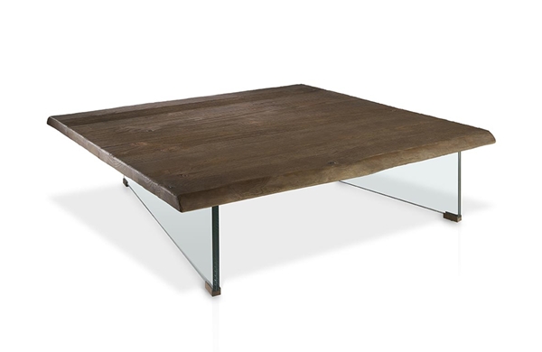 Mesa de centro con estructura de madera de mobila, con sobre de madera erosionada artesanalmente y con un perfil diferente en cada mesa.