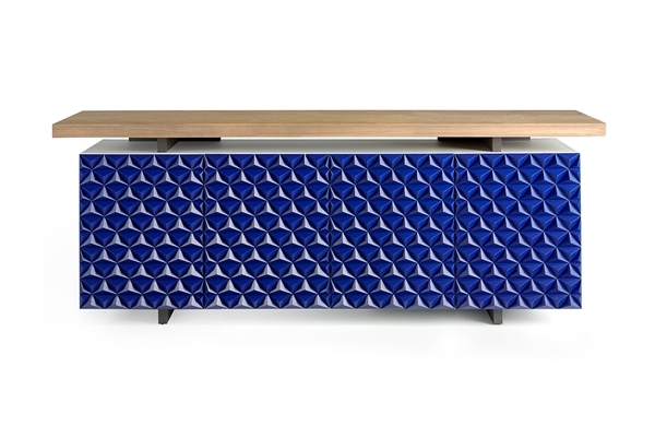 Aparador dallas con la tapa fabricada en madera de Roble marinado, el casco en madera de Fresno en C/185 Blanco Encalado y las puertas piramide en color C/216 Azul Eléctrico.