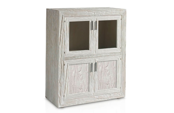 Aparador vitrina con estructura, frentes de cajones y puertas fabricados en madera de mobila erosionada artesanalmente. Cristal transparente en la parte alta y plafón de madera erosionada en la parte baja con estante de madera en su interior.