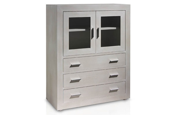 Mueble aparador fabricado en madera de roble con dos puertas superiores con cristal transparente, interior con estante de madera y tres cajones inferiores.