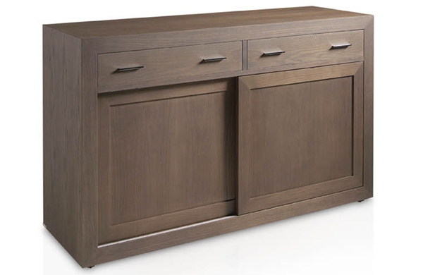 Mueble aparador fabricado en madera de roble con dos cajones, dos puertas correderas y un estante interior de madera.