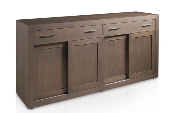Mueble aparador fabricado en madera de roble con dos cajones, cuatro puertas correderas y dos estantes interiores de madera.