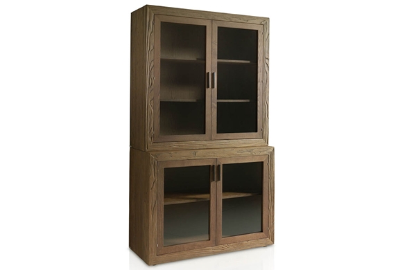 Aparador Vitrina compuesto por dos módulos con estructura de madera de mobila erosionada artesanalmente y frentes de puertas en madera de fresno con cristal transparente y estantes de madera en su interior.