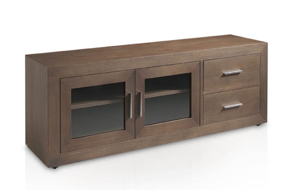 Mueble TV fabricado en madera de roble con dos puertas, con cristal transparente y estante interior de madera y dos cajones.