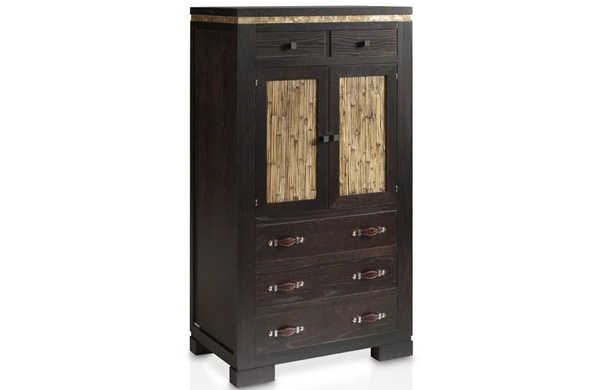 Puertas con plafones en caña de azúcar e interior con estante de madera y dos cajones con frente de cristal.