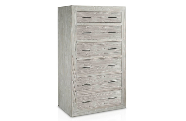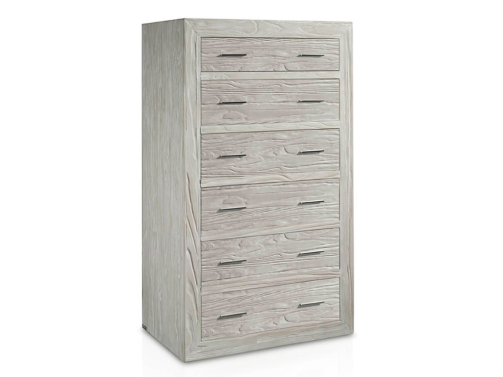 Chifonier de seis cajones con armazón y frentes de cajones fabricados en madera de mobila erosionada artesanalmente.