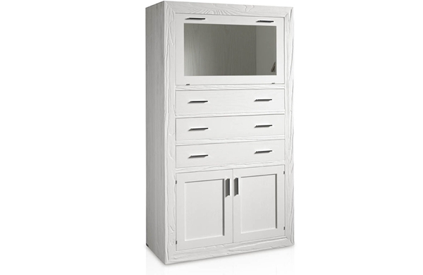 Vitrina con estructura de madera de mobila erosionada artesanalmente y frentes de cajones y puertas en madera de fresno, con botellero en la parte alta con puerta abatible con cristal transparente, con 3 cajones y 2 puertas con plafón de madera en la parte baja.