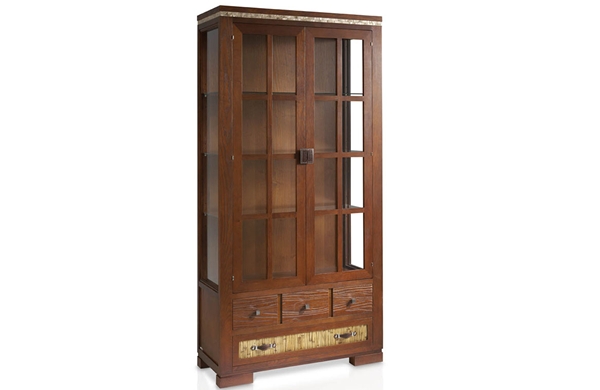 Vitrina fabricada con madera de fresno con dos puertas y laterales de cristal, detalle de nácar incrustado y dos cajones.
