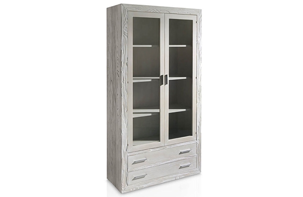 Vitrina 2 cajones y 2 puertas con estructura de madera de mobila erosionada artesanalmente, frentes de cajones y puertas en madera de fresno, con cristales transparentes en las puertas y con 3 estantes de madera en su interior.
